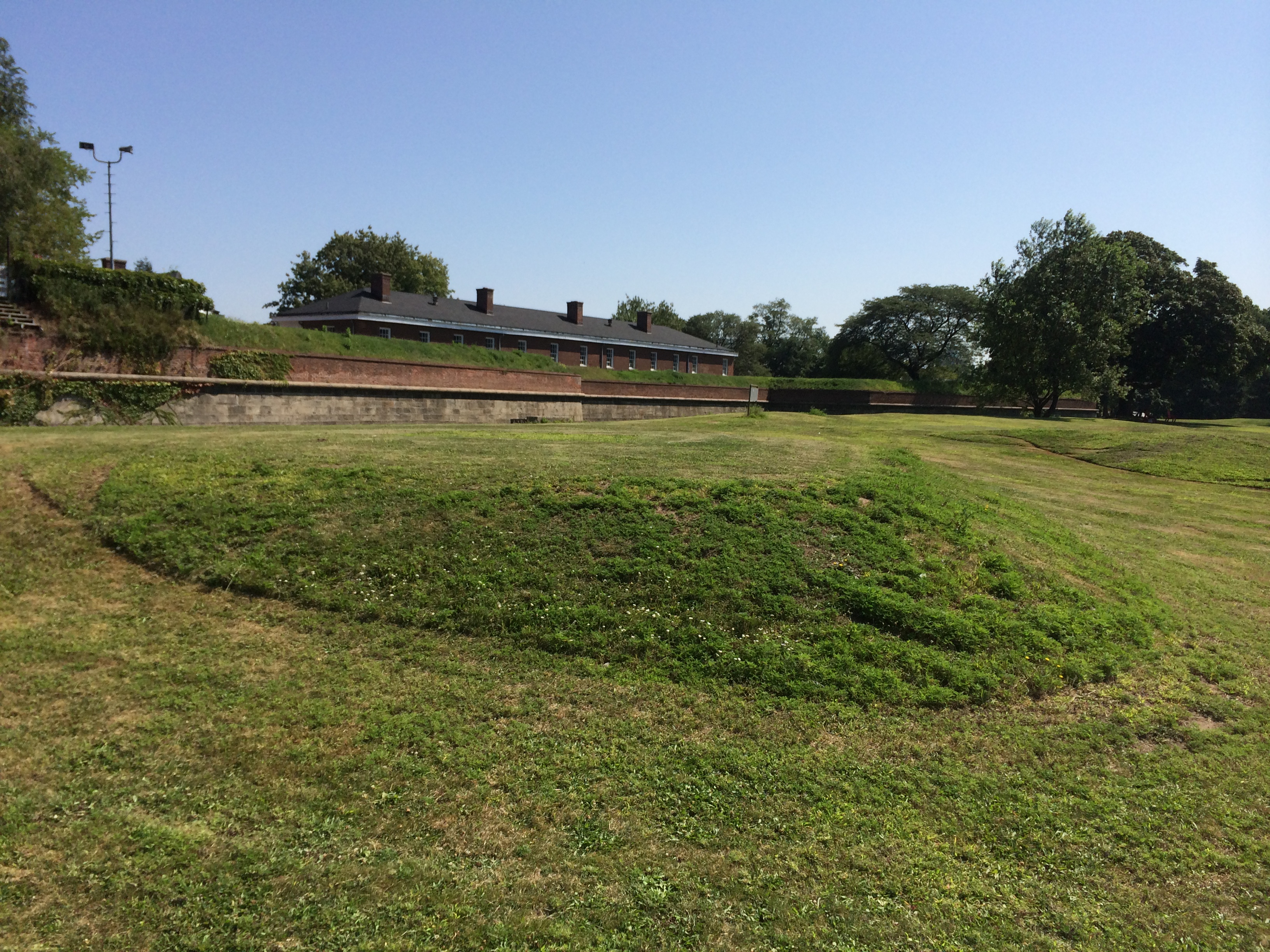 Comedian George Burns liked to say that golf is a good walk spoiled. This adage comes to mind when looking at the remnants of what was once the Governors Island nine-hole course. It was a short executive style set-up laid out on the glacis to the south and west of Fort Jay. The course measured about 1,900 years and played to a par thirty. It is easily recognizable today if one knows what to look for. The sand traps, putting greens, and tee boxes look almost like archaeological ruins. These are now choice spots for picnickers and sunbathers. Note how close the golf course is to both Fort Jay and the neighboring residential houses and apartments. Army officers stationed on the island liked their golf course and played frequently. Still, golf being what it is, even the best of them sometimes had their off days. According to one account it was on the links here at Governors Island that “young West Pointers were taught to swear.”