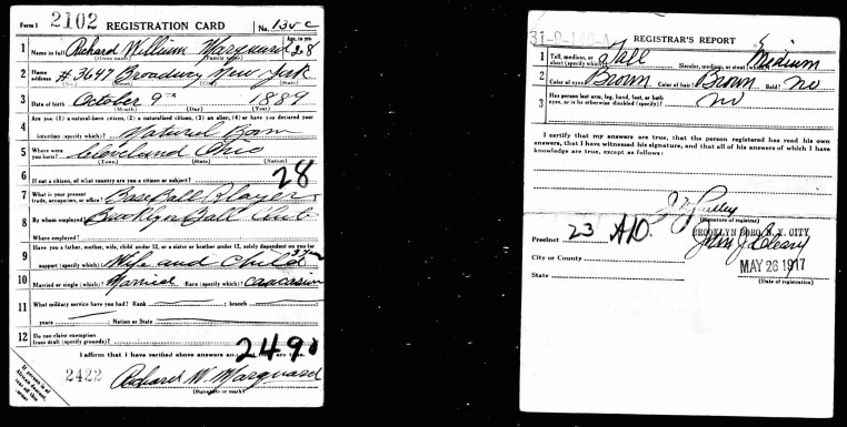 Thinking of Rube Marquard on Opening Day 2016 03 Sunday Apr 2016 Original size at 3013 × 1526 ≈ Leave a comment His draft registration card. It is interesting to note that he lived in Upper Manhattan, which is not surprising given that he played for the Giants before the Robins.