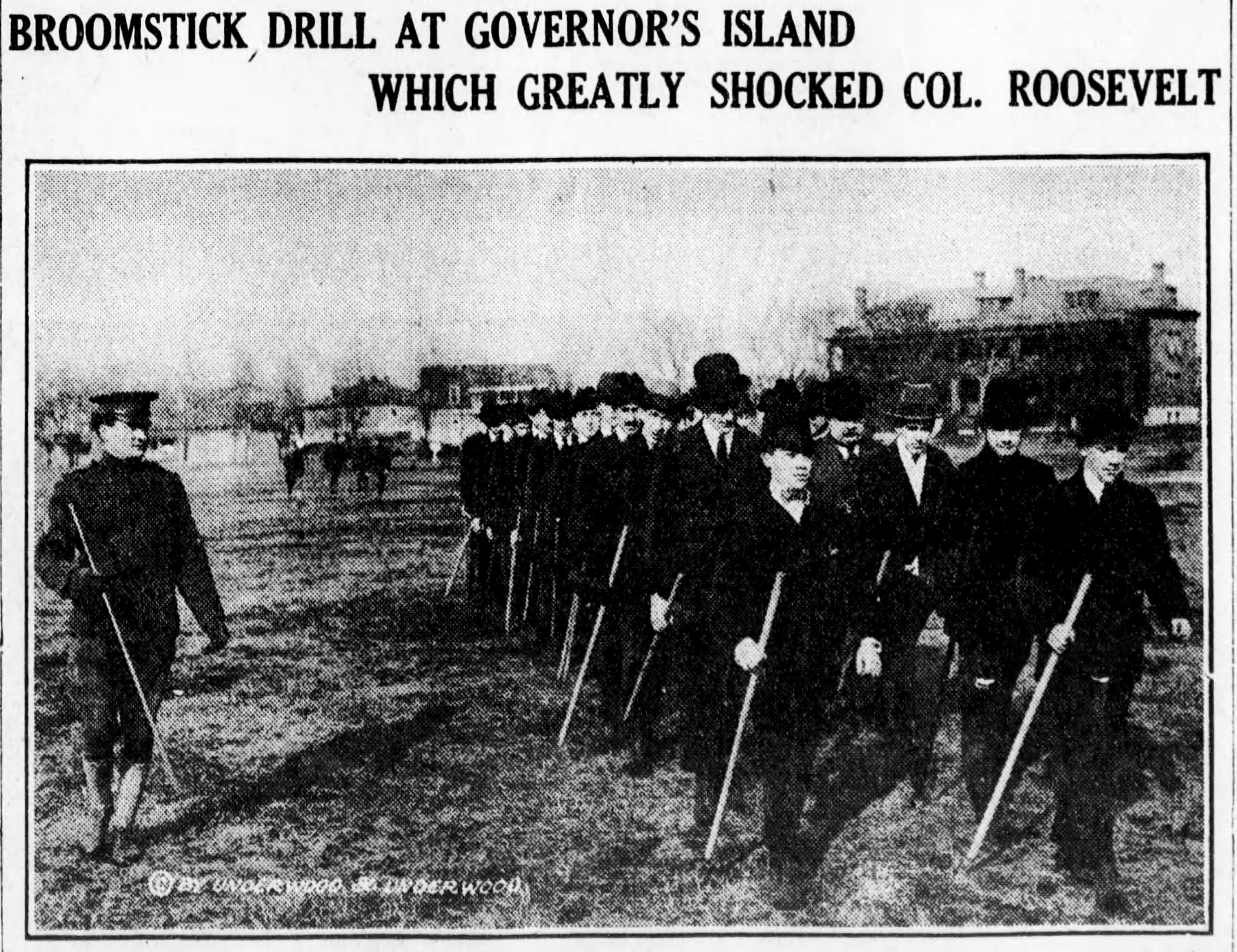 Civilian Plattsburgh participants march on Governors Island with broomsticks, February 1917. It is not clear from the original Brooklyn Daily Eagle caption if this image was taken the day Colonel Roosevelt turned out at Governors Island on 17 February 1917 to meet Leonard Wood and give his support to the men.