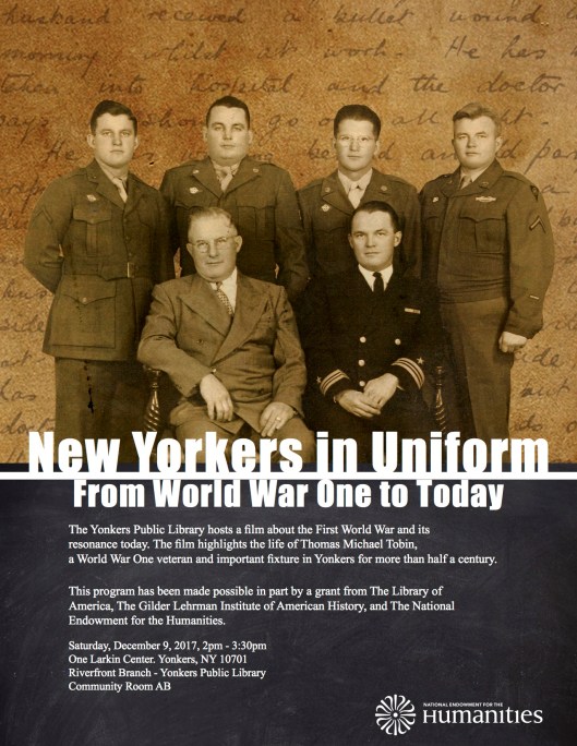 Good morning, all. I know the blog has been quiet for much of this past week but there has been so much going on. This morning I emailed the draft of a small thing I wrote over these past few days. I won’t go into the details here, but will wait until it is published. I am having my morning coffee before heading to Baruch College for a library conference. I always enjoy the 69th Regiment Armory there on 25th Street as I’m on my way to Baruch. I spent the morning sending a few emails about a film showing we are having a week from tomorrow in Yonkers. I am glad we are going to the community where our doughboy, Thomas Michael Tobin, lived and built a legacy for himself and his family. Here is the flier in case one is in the New York City area next weekend.